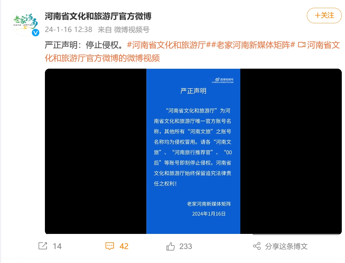 1月16日,河南省文化和旅游厅在官方微博、抖音账号发布严正声明称,“河南省文化和旅游厅”为河南省文化和旅游厅唯一官方账号名称,其他所有“河南文旅”之账号名称均为侵权冒用。请各“河南文旅”、“00河南旅行推荐官后”等账号即刻停止侵权。河南省文化和旅游厅始终保留追究法律责任之权利!