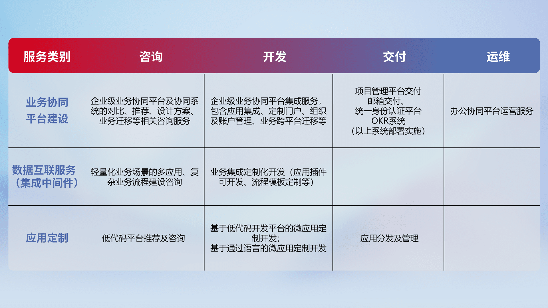 针对钉钉、、企微、、、IDaas等平台级产品提供产品的规划、、、方案、、、、交付、、、、定制化开发等服务,,实现如统一协同办公、、、、智能客户服务、、、混合会议管理、、智能数据查询、、等业务场景,,实现数字化转型。。。。